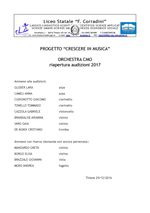 Nuove selezioni orchestrali 2017